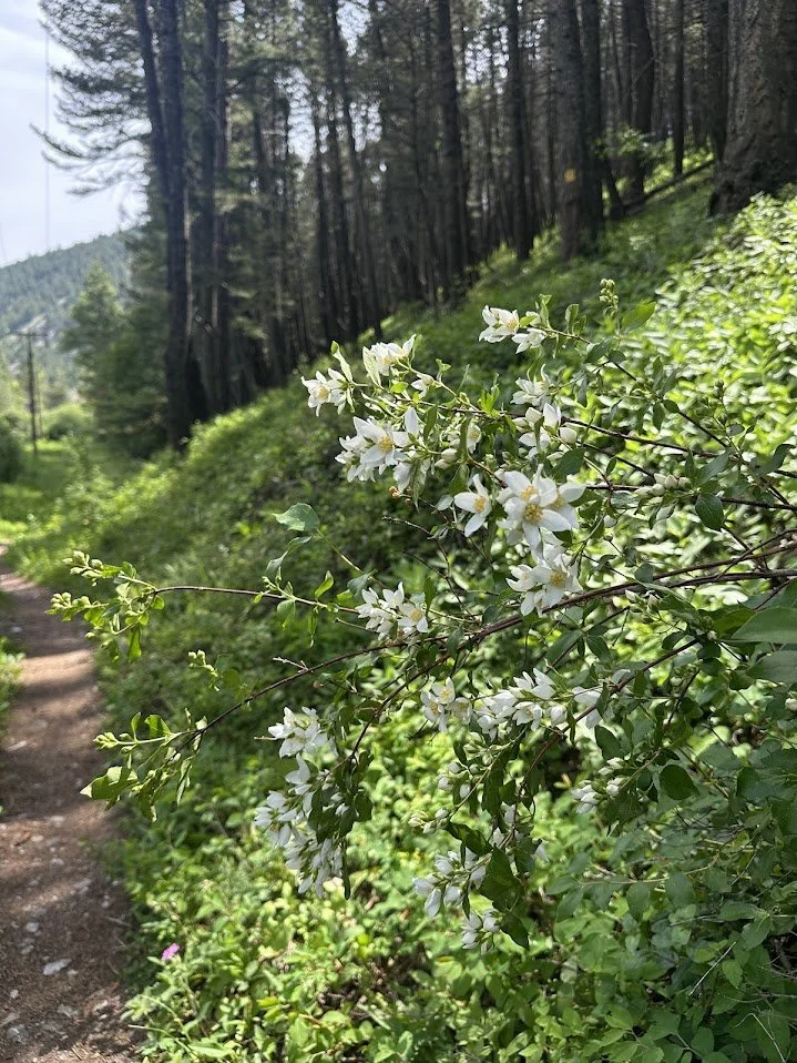 Come June, fragrant white blooms of Philadelphus lewisii, Cornus sericea, and Rosa acicularis beckon the transition from spring to summer. Beneath the flowering shrubs, an elegant display of beauties such as Campanula rotundifolia, Penstemon procerus, Heuchera cylindrica and Allium cernuum bursts and buzzes with insects. A lone spotted Fritillaria atropurpurea makes for a delightful discovery, and here and there, Cypripedium montanum can be found carrying on the orchid magic.
